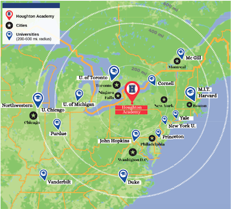 ヒューテン・アカデミーは、アメリカ合衆国/カナダおよび世界で最も有名で結びつきの強い地域に戦略的に位置しています。ニューヨーク市をはじめ、ボストン、シカゴ、ワシントンD.C.、トロント、モントリオール、ケベックシティなどの主要な政治・教育の中心地が近隣にあります。アメリカのトップ25大学のうち18校、世界のトップ25大学のうち10校が、ヒューテン・アカデミーから日帰り圏内にあります。アメリカ東海岸の都市部の資源へのアクセスが容易でありながら、ヒューテン・アカデミーは魅力的で友好的な小さな町の文化の中で、安全性と学習に集中できる環境を提供しています。ヒューテン・アカデミーとホーテン大学は、140年以上にわたり、世界中の何千もの学生にとって「故郷」のような場所となっています。